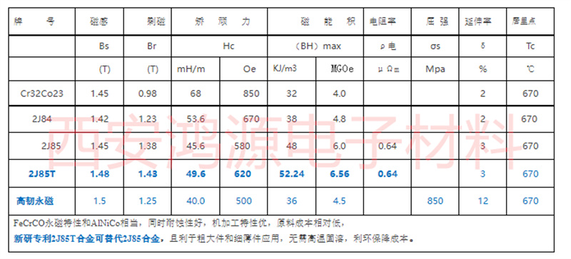 FeCrCo系永磁合金性能列表