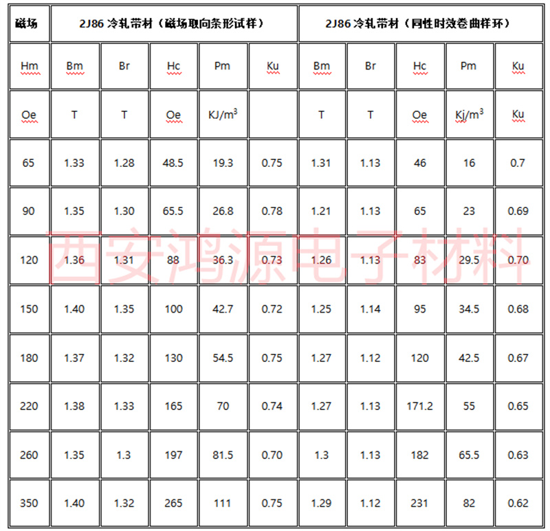 2J86合金是在2J85T合金的基础上,通过进一步的降低Cr、Co含量,使合金的矫顽力进一步降低,显著提高同性时效时的Br及Ku,进一步降低Hc的温度系数,该合金在低磁化场Hm=50~350Oe条件下的磁滞性能比2J85T及和2J85显著提高,其冷加工带材、丝材及热加工棒材均具有良好的磁滞性能,超过FeCrCo系、FeCoW系、FeCoMo系合金的磁滞性能,且矫顽力Hc的温度稳定性较好,可以满足更多的实用需求,同时机加工特性良好,具有抗氧化特性。