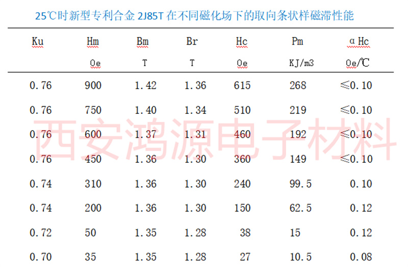 新型发明2J85T磁滞合金,因为其矫顽力温度系数αHc仅为传统FeCrCo系半硬磁合金的1/5~1/3,产品磁滞性能的温度稳定性大幅度提高,所以在Hc=240~620 Oe范围内,可以满足传统磁滞合金的αPu≤0.03%/℃的稳定可靠性需求,从而形成全新的磁滞合金新牌号。这种新型磁滞合金,不仅拓宽传统磁滞合金的工作场范围,且磁滞性能Pm明显提高,耐蚀性提高,可加工特性较好,产品成本低、脆性低,可获得韧性永磁,同时其冷加工材料和热加工材料都具有优异磁滞性能,这些优异特性是传统FeCoV、FeCoMo系磁滞合金及FeCrCo系半硬磁合金不具有的。 2J85T合金在670~1200℃范围内基本上为完全的α组织,消除了2J85和Cr28Co10.5Si合金所必需的1150~1300℃温区的高温固溶水淬工艺来获得完全的α相组织,同时消除了淬火变形、淬火不均、淬透性不够、表面氧化严重等问题,不仅可以简化生产工序,且利于粗大件和细薄件的工业化生产,此外2J85T合金也具有FeCrCo系合金的最优永磁性能(Hc=620Oe、BHmax=6.5MGOe),综上所述2J85T合金可以完全取代传统的2T85合金。